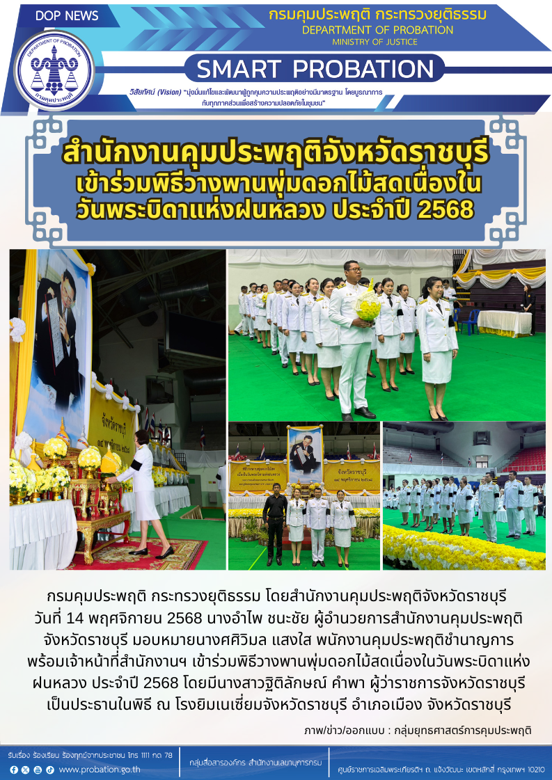 กรมคุมประพฤติ กระทรวงยุติธรรม โดยสำนักงานคุมประพฤติจังหวัดราชบุรี วันที่ 14 พฤศจิกายน 2568 นางอำไพ ชนะชัย ผู้อำนวยการสำนักงานคุมประพฤติจังหวัดราชบุรี มอบหมายนางศศิวิมล แสงใส พนักงานคุมประพฤติชำนาญการ พร้อมเจ้าหน้าที่สำนักงานฯ เข้าร่วมพิธีวางพานพุ่มดอกไม้สดเนื่องในวันพระบิดาแห่งฝนหลวง ประจำปี 2568 โดยมีนางสาวฐิติลักษณ์ คำพา ผู้ว่าราชการจังหวัดราชบุรี เป็นประธานในพิธี ณ โรงยิมเนเซี่ยมจังหวัดราชบุรี อำเภอเมือง จังหวัดราชบุรี
