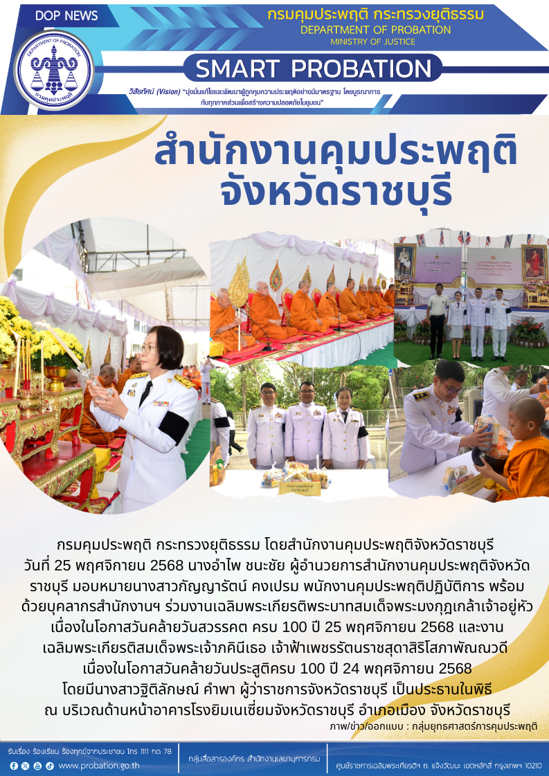 วันที่ 25 พฤศจิกายน 2568 นางอำไพ ชนะชัย ผู้อำนวยการสำนักงานคุมประพฤติจังหวัดราชบุรี มอบหมายนางสาวกัญญารัตน์ คงเปรม พนักงานคุมประพฤติปฏิบัติการ พร้อมด้วยบุคลากรสำนักงานฯ ร่วมงานเฉลิมพระเกียรติพระบาทสมเด็จพระมงกุฎเกล้าเจ้าอยู่หัว เนื่องในโอกาสวันคล้ายวันสวรรคต ครบ 100 ปี 25 พฤศจิกายน 2568 และงานเฉลิมพระเกียรติสมเด็จพระเจ้าภคินีเธอ เจ้าฟ้าเพชรรัตนราชสุดาสิริโสภาพัณณวดี เนื่องในโอกาสวันคล้ายวันประสูติครบ 100 ปี 24 พฤศจิกายน 2568 โดยมีนางสาวฐิติลักษณ์ คำพา ผู้ว่าราชการจังหวัดราชบุรี เป็นประธานในพิธี