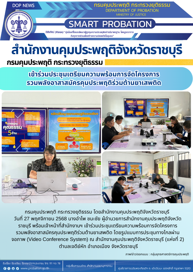 กรมคุมประพฤติ กระทรวงยุติธรรม โดยสำนักงานคุมประพฤติจังหวัดราชบุรี วันที่ 27 พฤศจิกายน 2568 นางอำไพ ชนะชัย ผู้อำนวยการสำนักงานคุมประพฤติจังหวัดราชบุรี พร้อมเจ้าหน้าที่สำนักงานฯ เข้าร่วมประชุมเตรียมความพร้อมการจัดโครงการรวมพลังอาสาสมัครคุมประพฤติร่วมต้านยาเสพติด โดยรูปแบบการประชุมทางไกลผ่านจอภาพ (Video Conference System) ณ สำนักงานคุมประพฤติจังหวัดราชบุรี (แห่งที่ 2) ตำบลเจดีย์หัก อำเภอเมือง จังหวัดราชบุรี