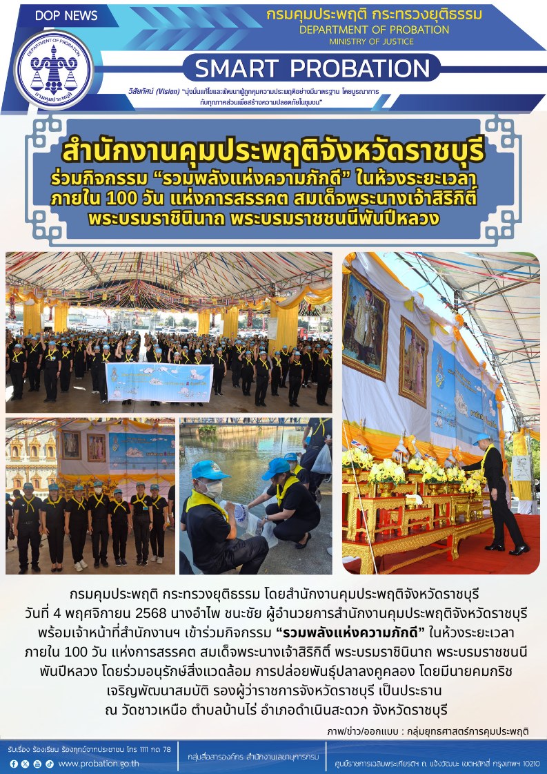 วันที่ 4 พฤศจิกายน 2568 นางอำไพ ชนะชัย ผู้อำนวยการสำนักงานคุมประพฤติจังหวัดราชบุรี พร้อมเจ้าหน้าที่สำนักงานฯ เข้าร่วมกิจกรรม “รวมพลังแห่งความภักดี” ในห้วงระยะเวลาภายใน 100 วัน แห่งการสรรคต สมเด็จพระนางเจ้าสิริกิติ์ พระบรมราชินินาถ พระบรมราชชนนีพันปีหลวง โดยร่วมอนุรักษ์สิ่งแวดล้อม การปล่อยพันธุ์ปลาลงคูคลอง โดยมีนายคมกริช เจริญพัฒนาสมบัติ รองผู้ว่าราชการจังหวัดราชบุรี เป็นประธาน ณ วัดชาวเหนือ ตำบลบ้านไร่ อำเภอดำเนินสะดวก จังหวัดราชบุรี