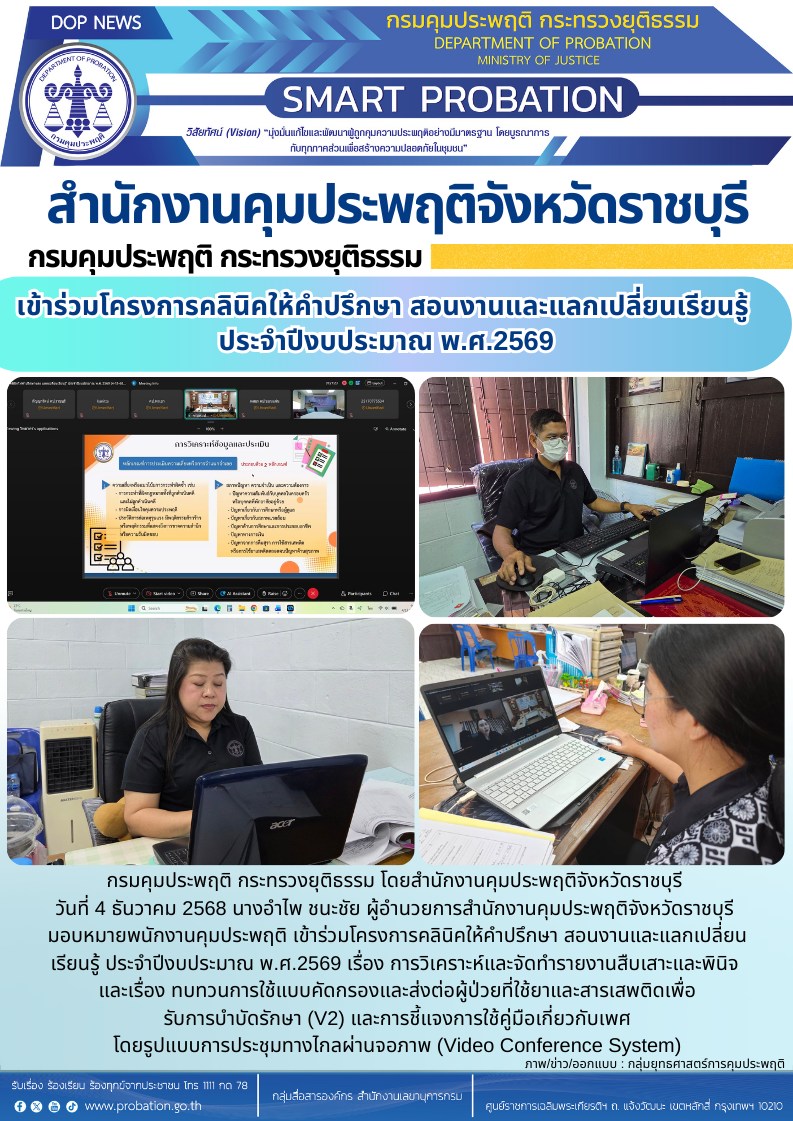 วันที่ 4 ธันวาคม 2568 นางอำไพ ชนะชัย ผู้อำนวยการสำนักงานคุมประพฤติจังหวัดราชบุรี มอบหมายพนักงานคุมประพฤติ เข้าร่วมโครงการคลินิคให้คำปรึกษา สอนงานและแลกเปลี่ยนเรียนรู้ ประจำปีงบประมาณ พ.ศ.2569 เรื่อง การวิเคราะห์และจัดทำรายงานสืบเสาะและพินิจ และเรื่อง ทบทวนการใช้แบบคัดกรองและส่งต่อผู้ป่วยที่ใช้ยาและสารเสพติดเพื่อรับการบำบัดรักษา (V2) และการชี้แจงการใช้คู่มือเกี่ยวกับเพศ โดยรูปแบบการประชุมทางไกลผ่านจอภาพ (Video Conference System)