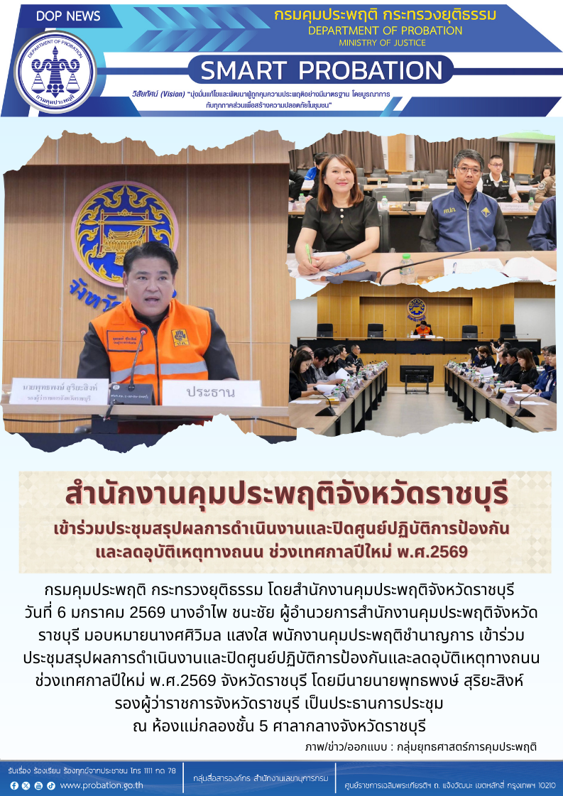 วันที่ 6 มกราคม 2569 นางอำไพ ชนะชัย ผู้อำนวยการสำนักงานคุมประพฤติจังหวัดราชบุรี มอบหมายนางศศิวิมล แสงใส พนักงานคุมประพฤติชำนาญการ เข้าร่วมประชุมสรุปผลการดำเนินงานและปิดศูนย์ปฏิบัติการป้องกันและลดอุบัติเหตุทางถนน ช่วงเทศกาลปีใหม่ พ.ศ.2569 จังหวัดราชบุรี โดยมีนายนายพุทธพงษ์ สุริยะสิงห์ รองผู้ว่าราชการจังหวัดราชบุรี เป็นประธานการประชุม ณ ห้องแม่กลองชั้น 5 ศาลากลางจังหวัดราชบุรี จังหวัดราชบุรี