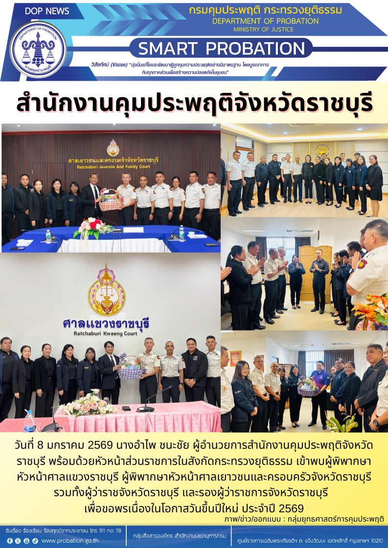 สำนักงานคุมประพฤติจังหวัดราชบุรีเข้าพบผู้พิพากษาหัวหน้าศาลแขวงราชบุรี ผู้พิพากษาหัวหน้าศาลเยาวชนและครอบครัวจังหวัดราชบุรี รวมทั้งผู้ว่าราชจังหวัดราชบุรี และรองผู้ว่าราชการจังหวัดราชบุรี เพื่อขอพรเนื่องในโอกาสวันขึ้นปีใหม่ ประจำปี 2569