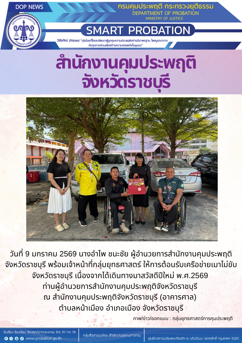 วันที่ 9 มกราคม 2569 นางอำไพ ชนะชัย ผู้อำนวยการสำนักงานคุมประพฤติจังหวัดราชบุรี พร้อมเจ้าหน้าที่กลุ่มยุทธศาสตร์ ให้การต้อนรับเครือข่ายเมาไม่ขับ จังหวัดราชบุรี เนื่องจากได้เดินทางมาสวัสดีปีใหม่ พ.ศ.2569 ท่านผู้อำนวยการสำนักงานคุมประพฤติจังหวัดราชบุรี ณ สำนักงานคุมประพฤติจังหวัดราชบุรี (อาคารศาล) ตำบลหน้าเมือง อำเภอเมือง จังหวัดราชบุรี