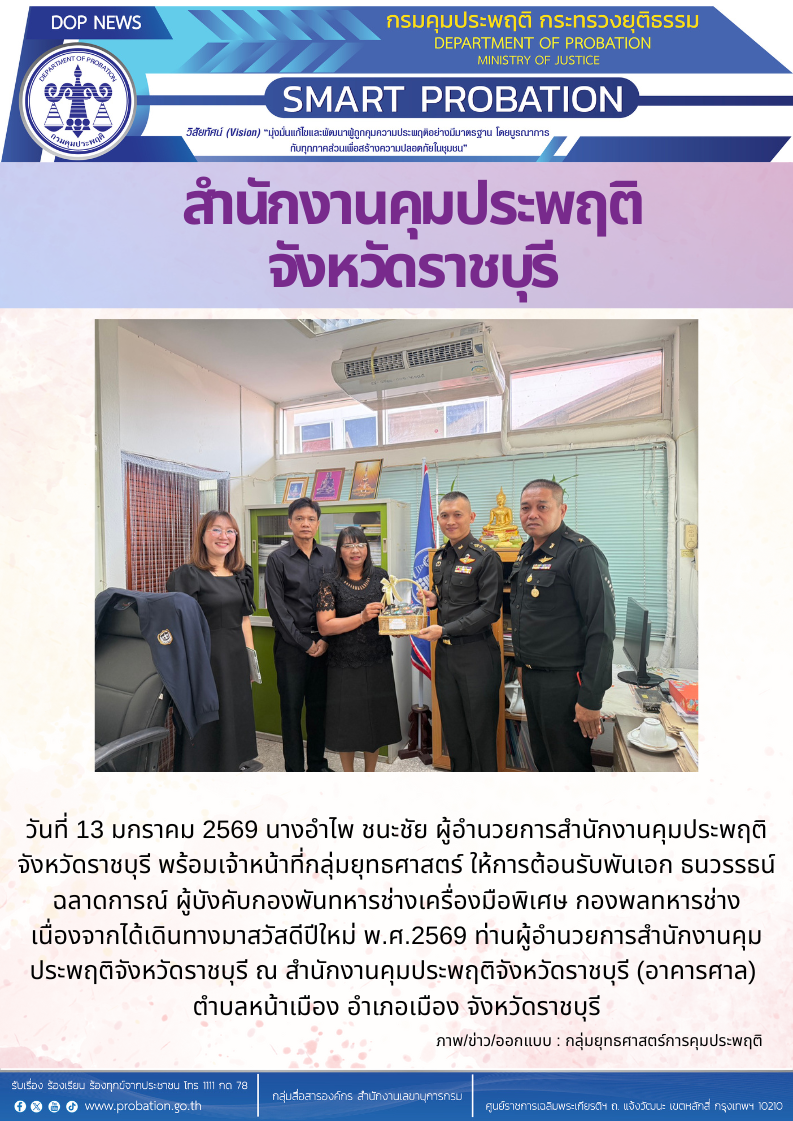ผู้อำนวยการสำนักงานคุมประพฤติจังหวัดราชบุรีให้การต้อนรับพันเอก ธนวรรธน์ ฉลาดการณ์ ผู้บังคับกองพันทหารช่างเครื่องมือพิเศษ กองพลทหารช่าง เนื่องจากได้เดินทางมาสวัสดีปีใหม่ พ.ศ.2569