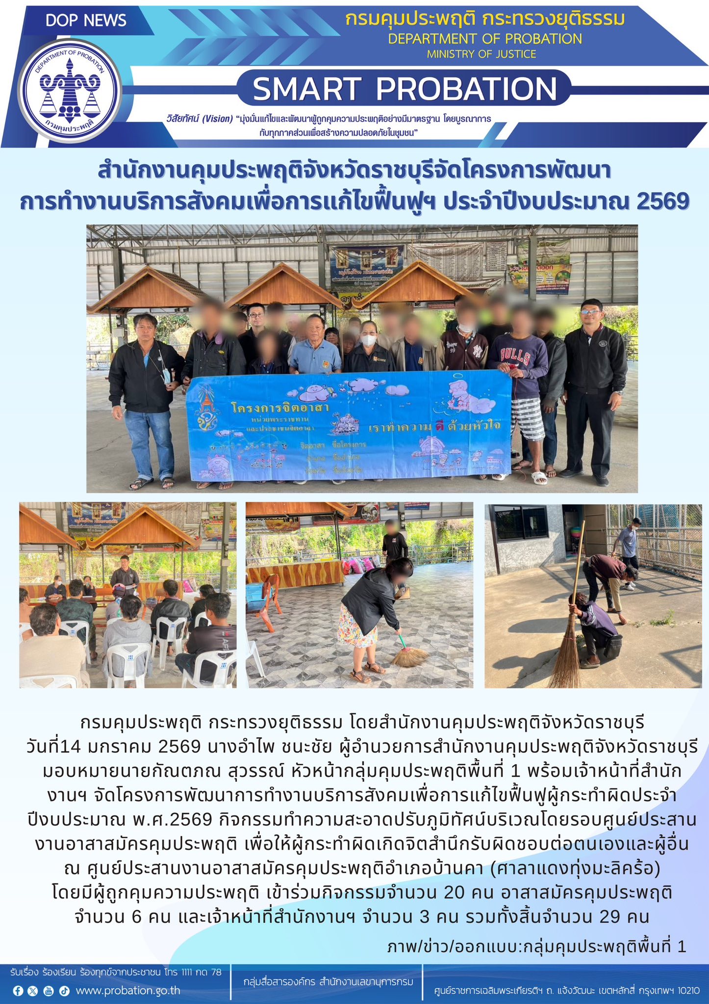 วันที่14 มกราคม 2569 นางอำไพ ชนะชัย ผู้อำนวยการสำนักงานคุมประพฤติจังหวัดราชบุรีมอบหมายนายกัณตภณ สุวรรณ์ หัวหน้ากลุ่มคุมประพฤติพื้นที่ 1 พร้อมเจ้าหน้าที่สำนักงานฯ จัดโครงการพัฒนาการทำงานบริการสังคมเพื่อการแก้ไขฟื้นฟูผู้กระทำผิดประจำปีงบประมาณ พ.ศ.2569 กิจกรรมทำความสะอาดปรับภูมิทัศน์บริเวณโดยรอบศูนย์ประสานงานอาสาสมัครคุมประพฤติเพื่อให้ผู้กระทำผิดเกิดจิตสำนึกรับผิดชอบต่อตนเองและผู้อื่น ณ ศูนย์ประสานงานอาสาสมัครคุมประพฤติอำเภอบ้านคา (ศาลาแดงทุ่งมะลิคร้อ)
