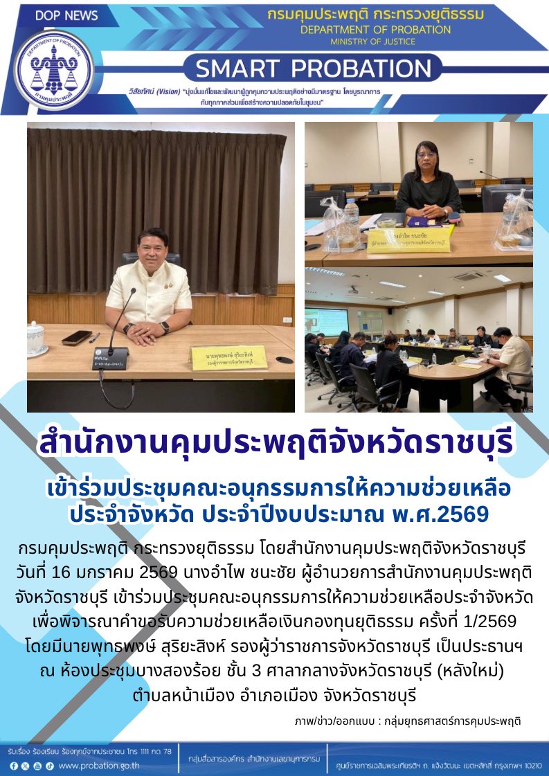 วันที่ 16 มกราคม 2569 นางอำไพ ชนะชัย ผู้อำนวยการสำนักงานคุมประพฤติจังหวัดราชบุรี เข้าร่วมประชุมคณะอนุกรรมการให้ความช่วยเหลือประจำจังหวัด เพื่อพิจารณาคำขอรับความช่วยเหลือเงินกองทุนยุติธรรม ครั้งที่ 1/2569 โดยมีนายพุทธพงษ์ สุริยะสิงห์ รองผู้ว่าราชการจังหวัดราชบุรี เป็นประธานฯ ณ ห้องประชุมบางสองร้อย ชั้น 3 ศาลากลางจังหวัดราชบุรี (หลังใหม่) ตำบลหน้าเมือง อำเภอเมือง จังหวัดราชบุรี