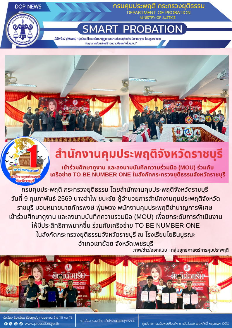 วันที่ 9 กุมภาพันธ์ 2569 นางอำไพ ชนะชัย ผู้อำนวยการสำนักงานคุมประพฤติจังหวัดราชบุรี มอบหมายนายภัทรพงษ์ พุ่มพวง พนักงานคุมประพฤติชำนาญการพิเศษ เข้าร่วมศึกษาดูงาน และลงนามบันทึกความร่วมมือ (MOU) เพื่อยกระดับการดำเนินงานให้มีประสิทธิภาพมากขึ้น ร่วมกับเครือข่าย TO BE NUMBER ONE ในสังกัดกระทรวงยุติธรรมจังหวัดราชบุรี ณ โรงเรียนโยธินบูรณะ อำเภอเขาย้อย จังหวัดเพชรบุรี